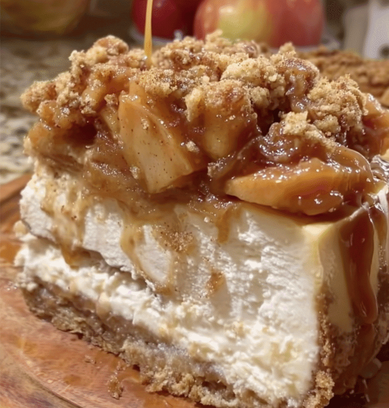 - Layer sliced apples on top of the filling and drizzle with caramel sauce.