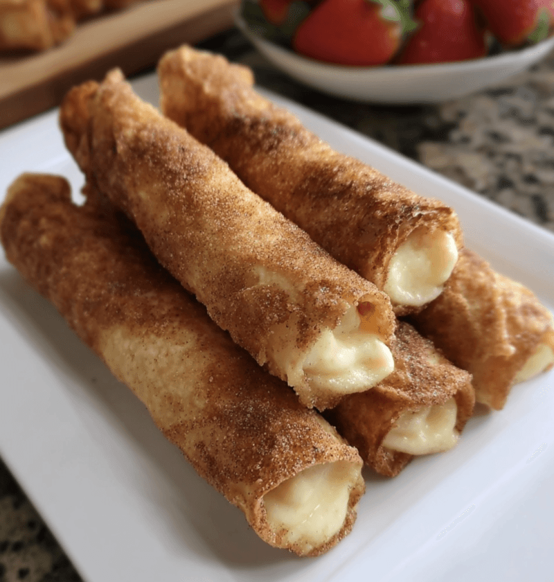 Crispy tortillas filled with a creamy and decadent cheesecake mixture, coated in cinnamon sugar for a delightful sweet and savory fusion treat.