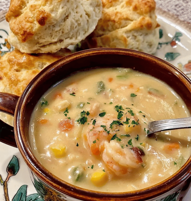 Delicious Sweet Corn Shrimp Chowder & Cheesy Garlic Biscuits Recipe