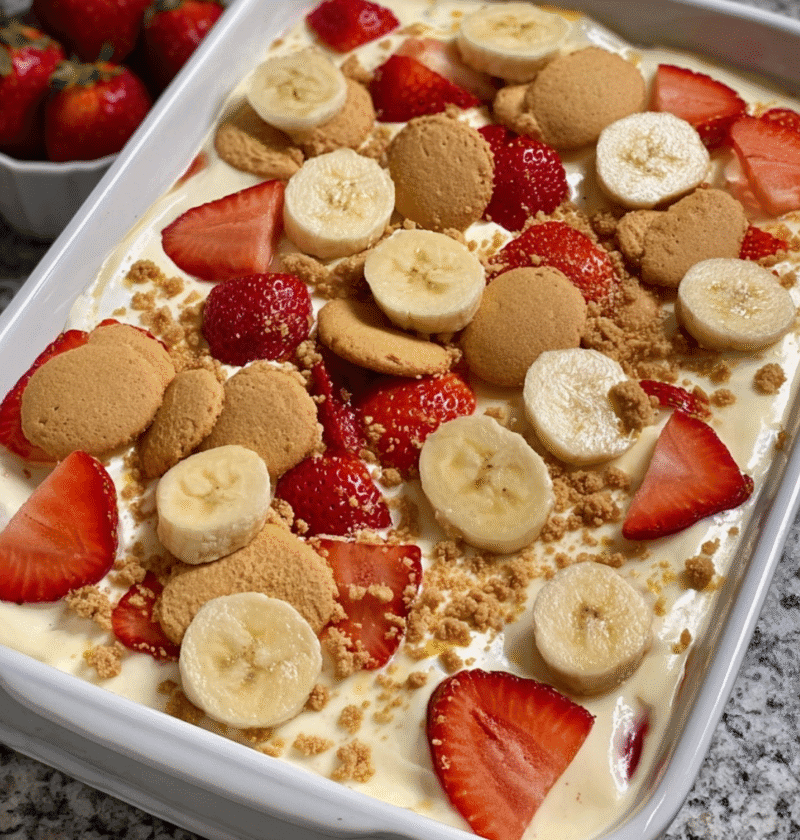 A delightful dessert that combines sweet strawberries, creamy bananas, and luscious pudding to create a heavenly treat that brings back memories of summer afternoons and family gatherings.