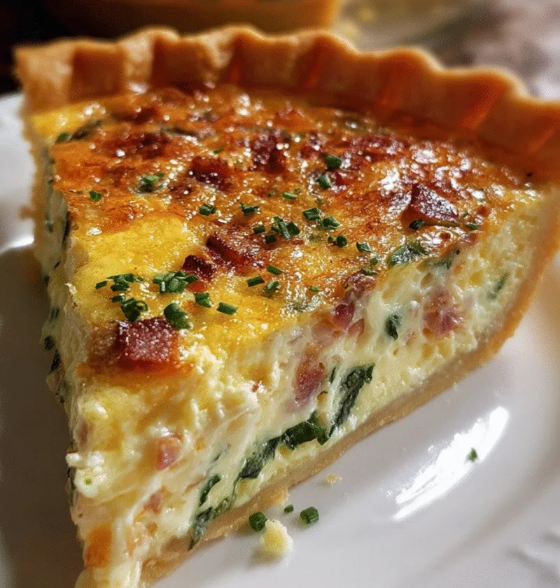 A savory and elegant Spinach and Bacon Quiche with a flaky crust, creamy custard filling, tender spinach, crispy bacon, and a golden cheesy topping. This classic dish is perfect for brunch, dinner, or any special occasion.