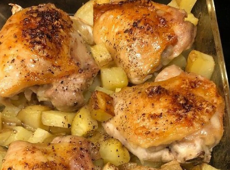 - Once the chicken and potatoes are cooked, remove the baking dish from the oven.