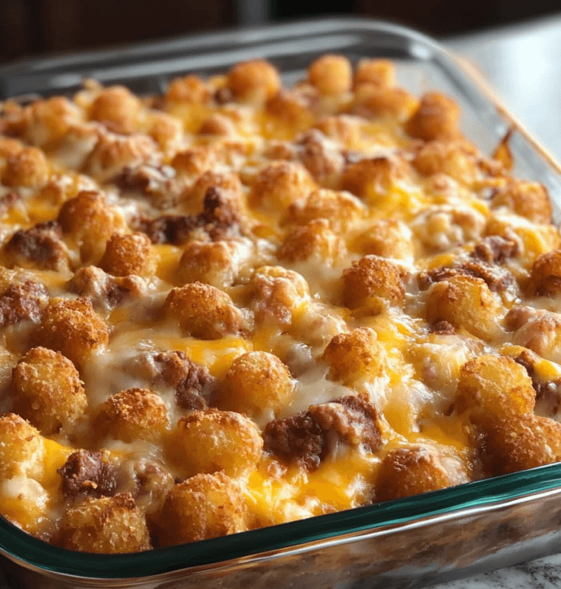 A hearty and satisfying breakfast dish that combines crispy tater tots, savory sausage, and gooey cheese, all baked to perfection.
